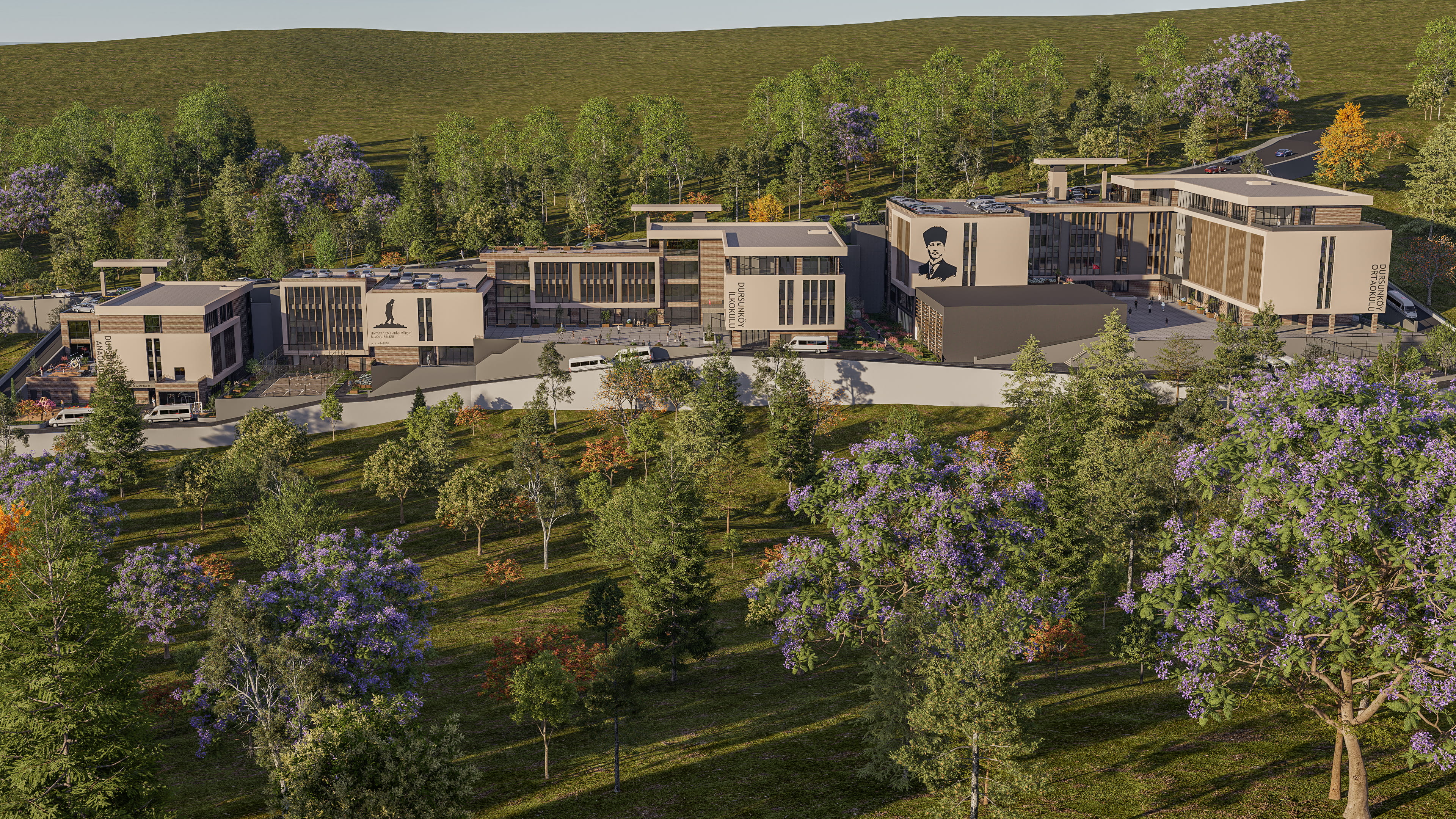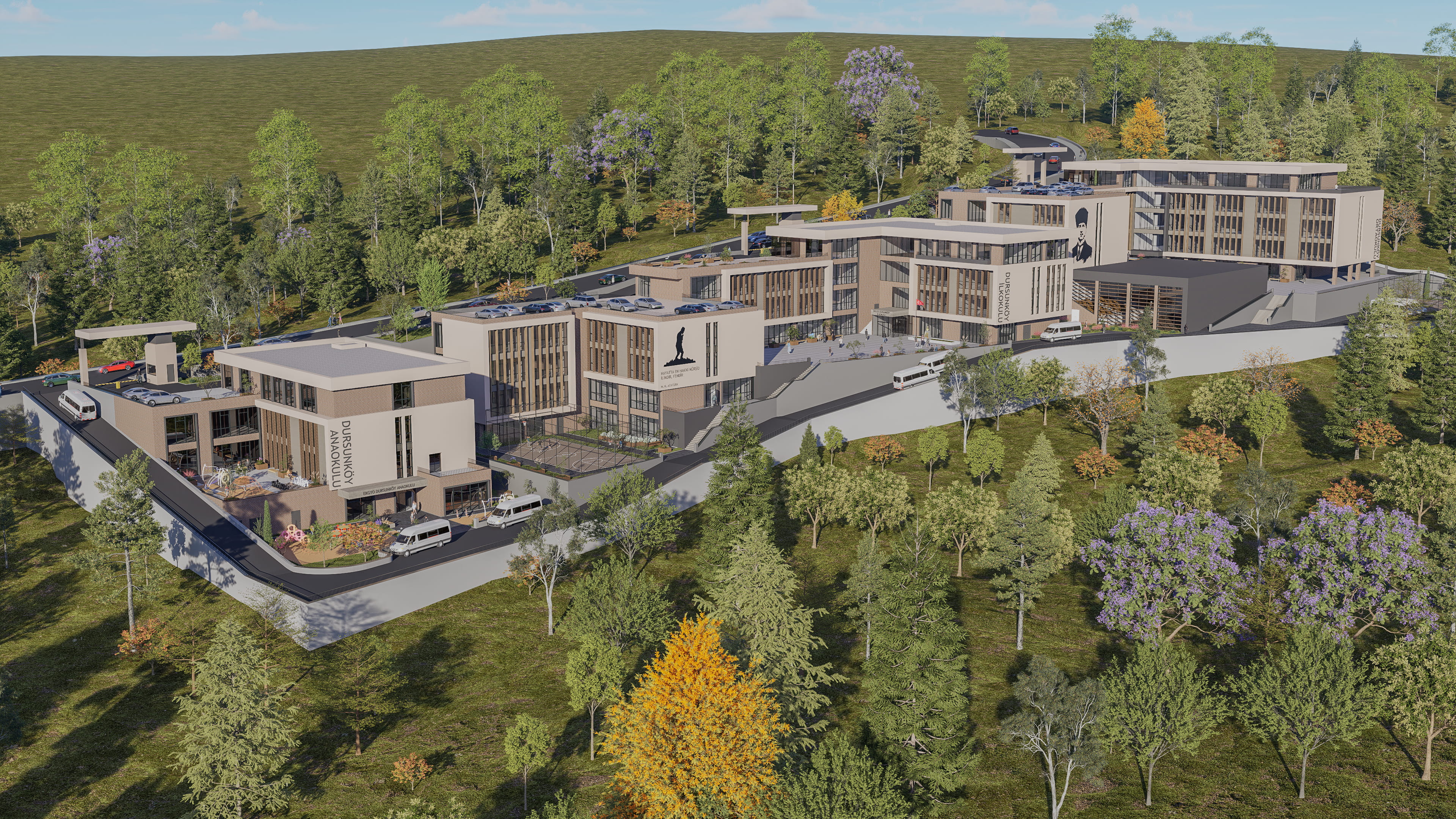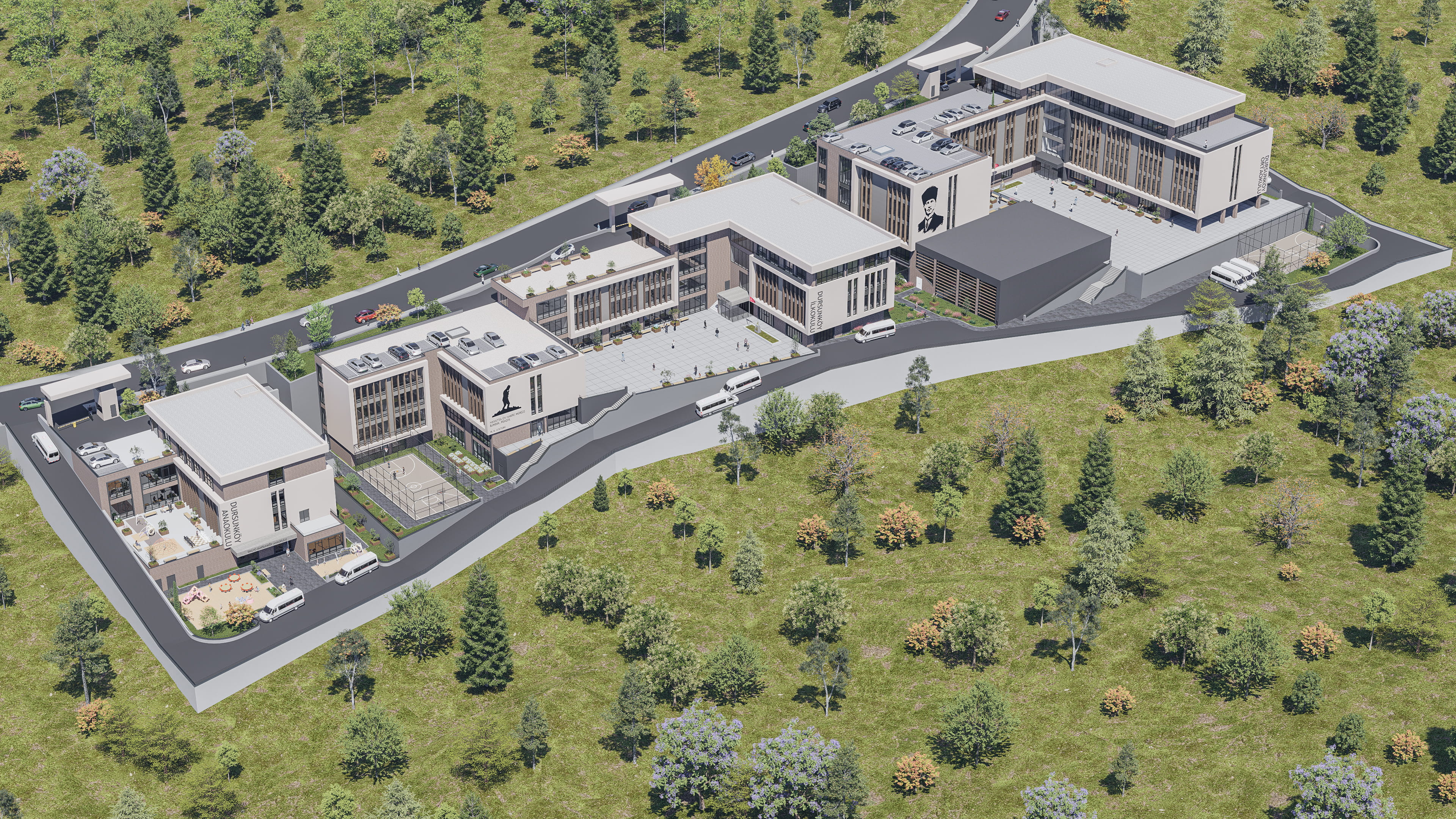 • Yaş gruplarına duyarlı tasarım: Her kademe kendi ihtiyaçlarına göre planlanmış, kontrollü ancak ilişkili bir kampüs düzeni oluşturulmuştur.